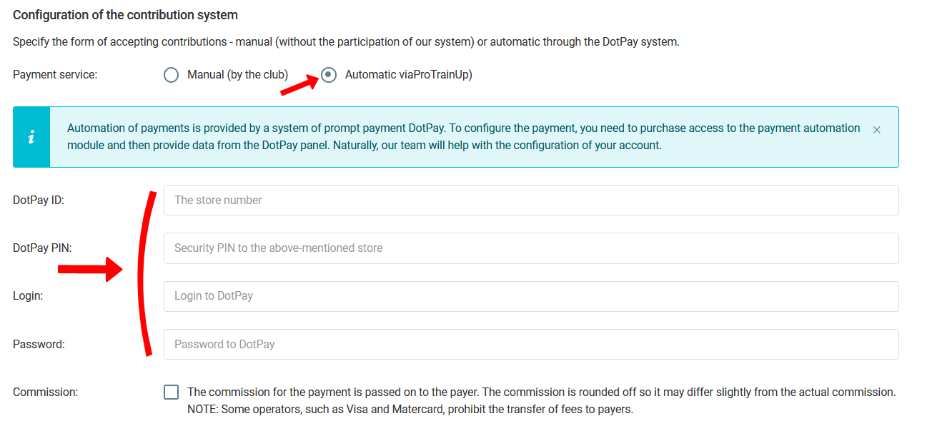 Una tercera opción para la contabilidad en el sistema de pagos es activar la posibilidad de pagar contribuciones directamente en el sistema ProTrainUp. Esta opción está disponible tanto a través de una aplicación móvil como a través de un navegador web. Sin embargo, antes de activar esta opción, debe completar una serie de acciones formales en nombre del club para crear y autorizar su cuenta DotPay.