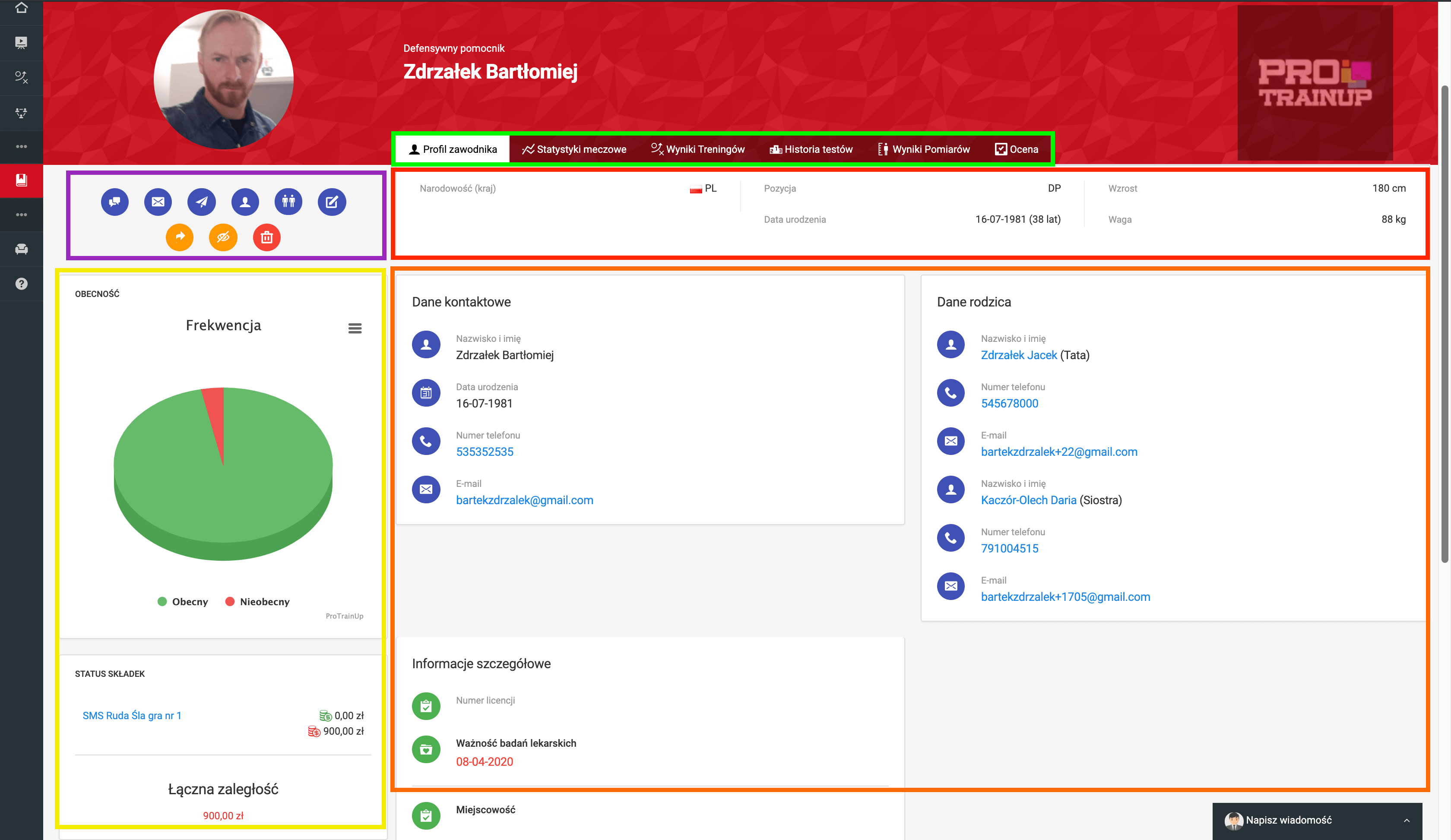 El perfil de un jugador consta de varias secciones, que están codificadas por colores en la imagen de arriba. Verde es una lista de marcadores, en los que se puede hacer clic para ir a la sección correspondiente del perfil del jugador. Violeta es el menú de funciones, que permite ejecutar acciones como editar el perfil, eliminar el perfil, ocultar al jugador, enviarle un mensaje privado o un correo electrónico. Rojo es la sección que muestra los datos métricos y antropométricos del jugador. Amarillo es la sección con información sobre asistencia y notas de contribución. Naranja es la sección que contiene los datos personales del jugador y sus padres.