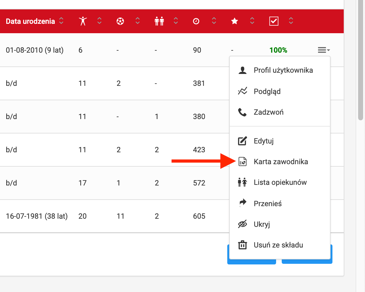 Para ir a la ficha de un jugador, vaya a la lista de jugadores, seleccione "Ficha del jugador" en el menú de la última columna de la tabla. Después de hacer clic en ella, será llevado a la página de la ficha del jugador, donde encontrará una lista de los logros del jugador durante la última temporada.